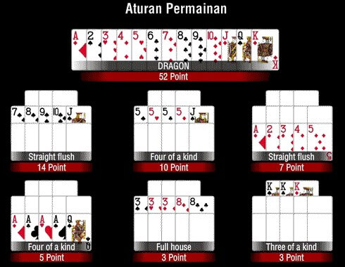 - 2,3,4,5,6,7,8,9,10,J,Q,K,A disebut Dragon angka terbesar dalam permainan Capsa Susun